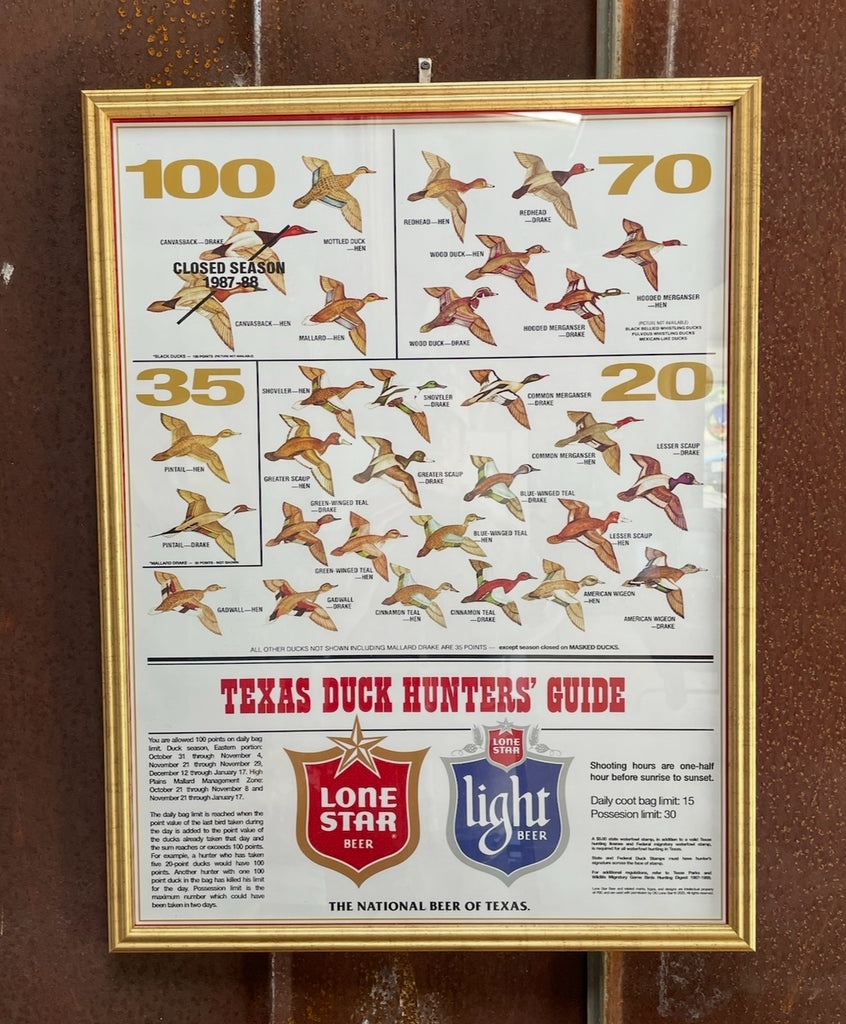 This hand-numbered, limited edition print is a replica of the Texas Duck Hunters’ Guide that Lone Star Beer released in 1987. This was the very last year that Texas used the points system. These are high quality prints and officially licensed by Lone Star Beer. Suitable for framing at 21” x 28” and now shipping!