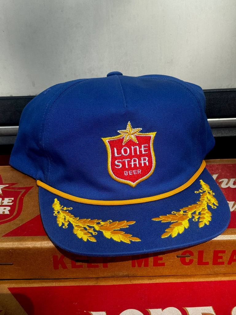 The classic Blue Lone Star Beer Captains Hat with the original scrambled eggs embroidery across the brim and bold lone star beer shield up top, back and better than ever! Custom made to my specifications with thick rope and an embroidery pattern on the bill that is identical to the originals that Lone Star put out forty something years ago. These are quality double snapback and have a reinforced crown just like the originals did. 100% cotton. Officially licensed bear gear.