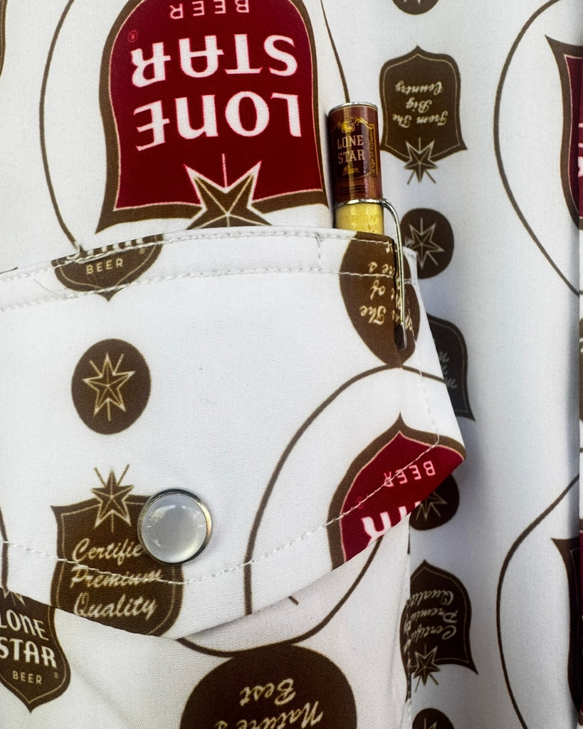 This is a performance pearl snap with 4-way stretch, moisture wicking fabric, a zippered side pocket, a lens cleaning cloth, and a pen or pencil slot.